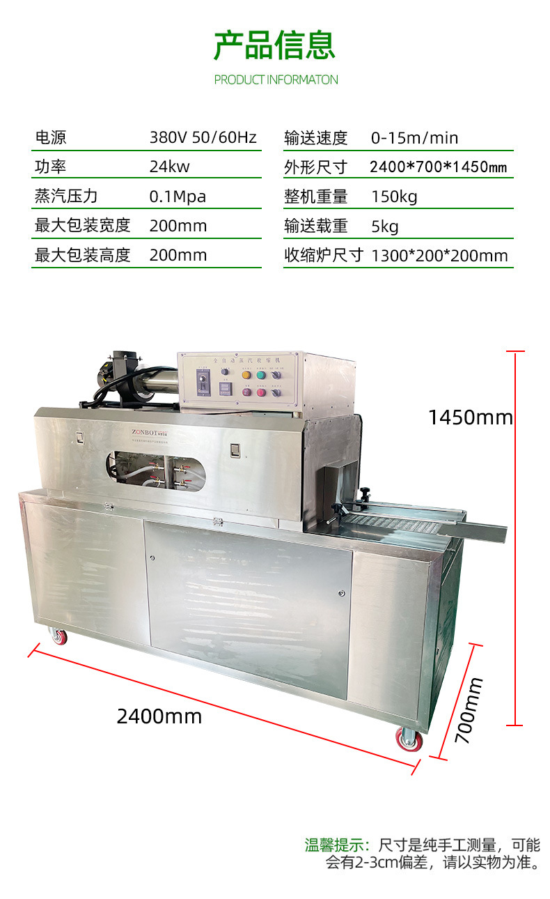 - 高效封裝:利用蒸汽的熱傳導(dǎo)性快速軟化膜材,收縮時(shí)間較傳統(tǒng)電加熱縮短 30%~50%;