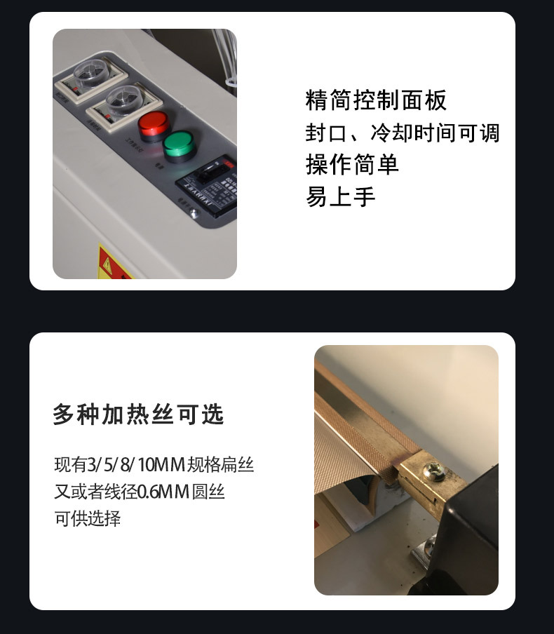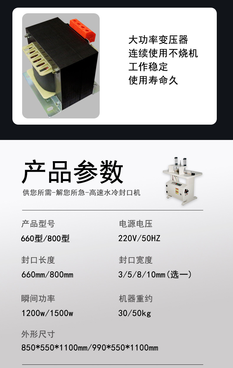在實(shí)際應(yīng)用中,用戶需根據(jù)膜材類型、包裝需求選擇合適參數(shù)。日常維護(hù)需關(guān)注水壓、加熱條清潔,定期進(jìn)行管道除垢、設(shè)備檢修。隨著技術(shù)發(fā)展,水冷封口機(jī)正朝著智能化、綠色化方向升級(jí),如集成 AI 視覺(jué)檢測(cè)、實(shí)現(xiàn)余熱回收,進(jìn)一步提升設(shè)備性能與環(huán)保效益。