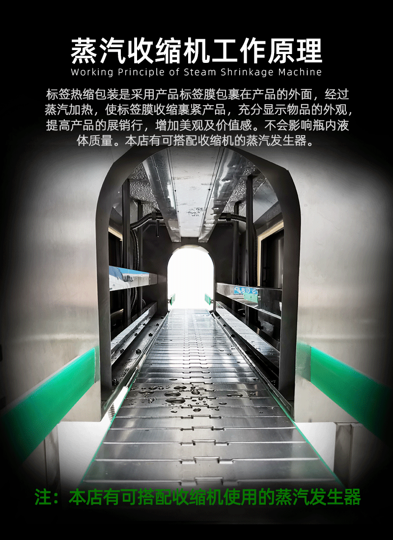 蒸汽收縮機通過加熱水產生蒸汽,將蒸汽輸送到收縮室內。當包裝好的物品進入收縮室時,蒸汽的熱量使包裝材料(如熱收縮膜)迅速升溫并收縮,緊緊地包裹住物品。