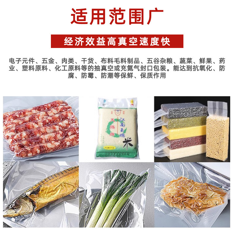 3. 外抽式真空:適用于各種形狀和尺寸的包裝袋,不受包裝袋內部物品形狀的限制。