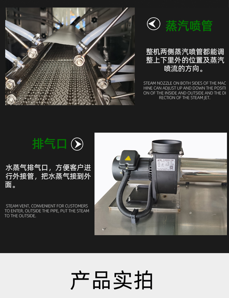 蒸汽收縮部分:蒸汽收縮一體機主要利用蒸汽的熱量使熱收縮薄膜收縮。蒸汽通過管道系統(tǒng)輸送到收縮腔室。當產(chǎn)品包裹著熱收縮薄膜進入收縮腔室后,高溫蒸汽包圍薄膜,使薄膜分子獲得能量。與傳統(tǒng)熱收縮機使用熱空氣或紅外線加熱不同,蒸汽的熱量傳遞方式更直接、均勻。蒸汽的溫度一般在 100 - 120℃左右,這個溫度范圍能夠使常見的熱收縮薄膜(如聚乙烯、聚氯乙烯等)分子鏈快速運動,薄膜從松弛狀態(tài)迅速收縮,緊密貼合在產(chǎn)品表面。而且,蒸汽能夠進入薄膜的微小縫隙,使收縮效果更好,尤其是對于一些形狀復雜、有凹陷或凸起的產(chǎn)品,能避免出