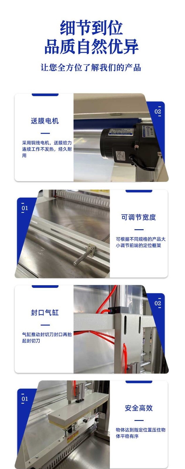 - 熱收縮定型:封切后的產品進入熱收縮區,這里有高溫熱風循環系統,使膜材均勻收縮,緊密貼合產品輪廓。比如有的設備采用螺旋風道設計,能有效提升收縮效率。