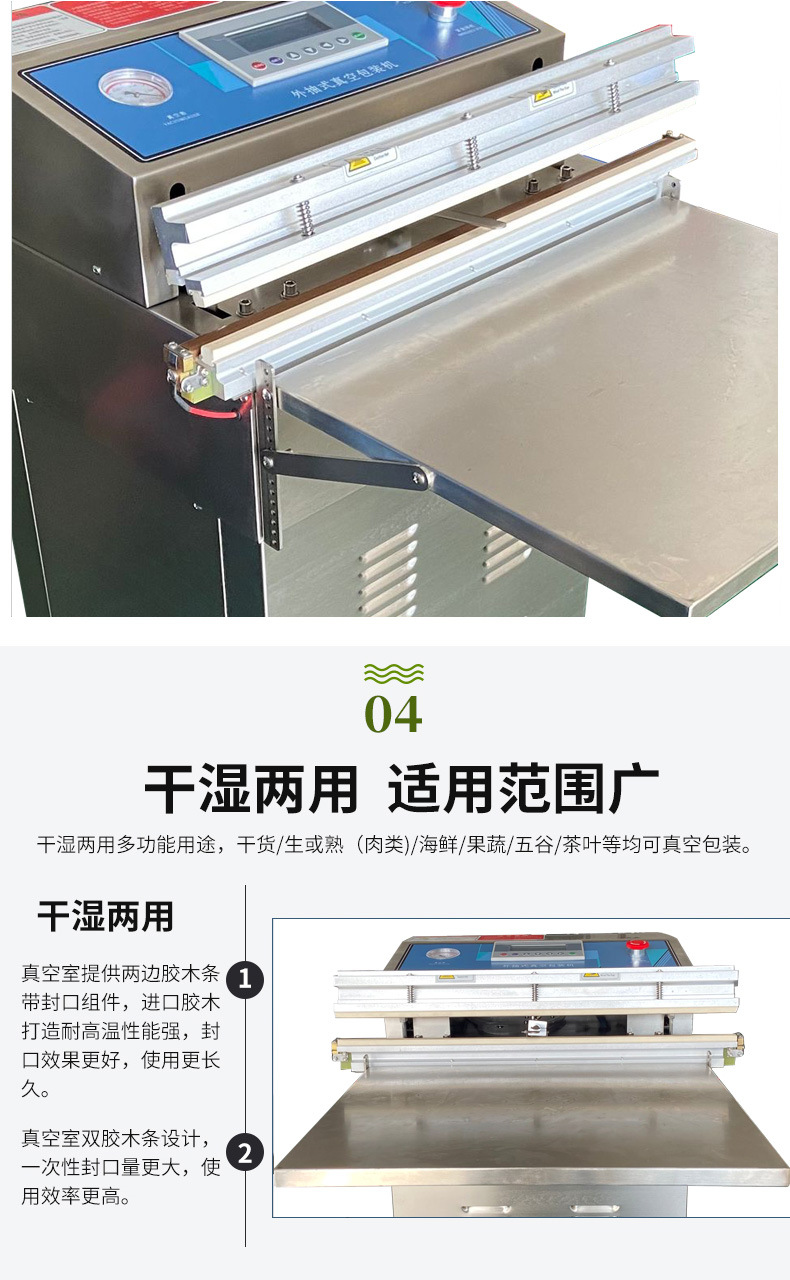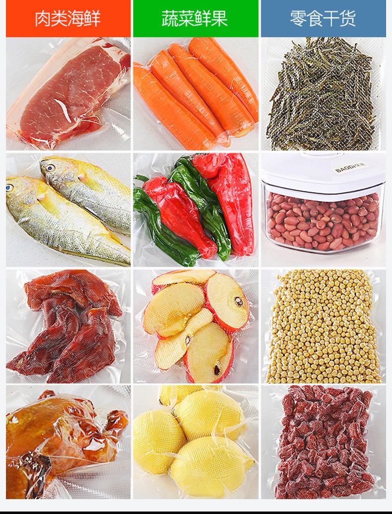 真空包裝機可適用于食品行業:真空包裝機可以將食品的氧氣和空氣抽出,有效防止食品氧化、腐敗、變質等現象的發生,保證食品的品質和口感。適用于肉類、水果、蔬菜、水產、干果、豆制品等多種食品的包裝。