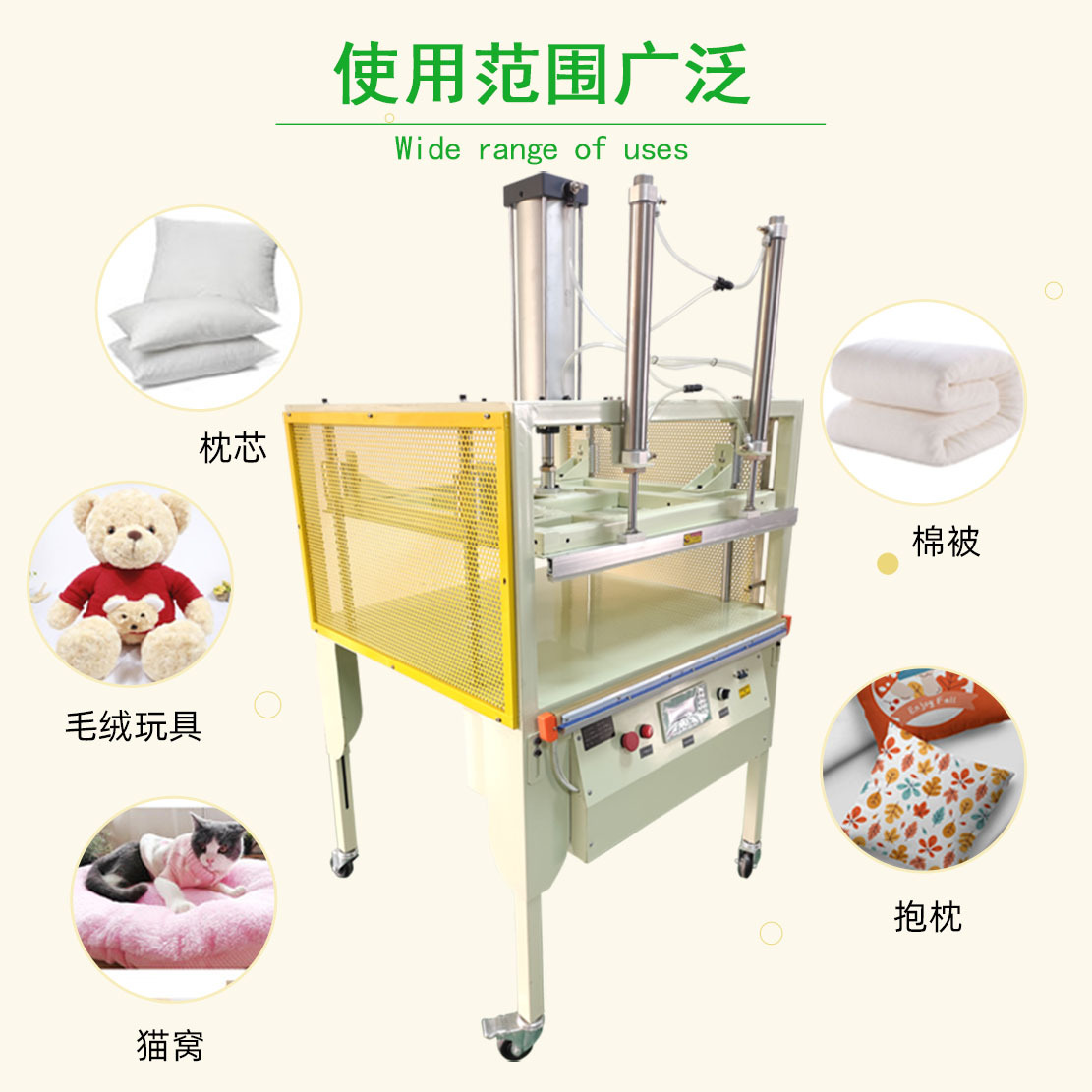 壓縮包裝封口機適用于壓縮包裝羽絨被服、太空棉被服、枕頭、發泡棉、毛巾等蓬松的其它物品??煽s小包裝的物品及防潮防塵